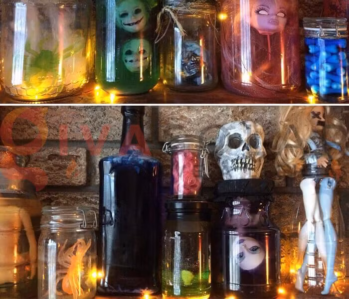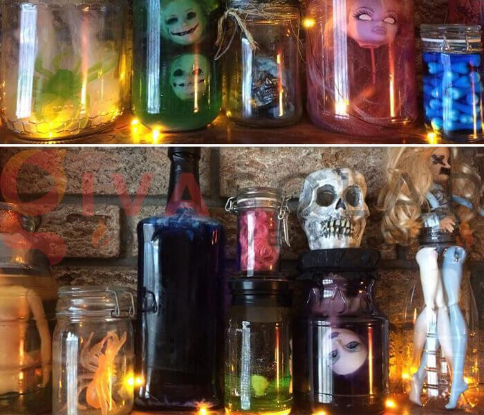 Bạn có thể lấy một lọ thủy tinh, đổ đầy nước rồi cho vài giọt nước màu xanh lá vào rồi chờ đến khi chúng hòa tan thành nước màu đẹp mắt. Cho những vật dụng bằng nhựa như đầu, tay, chân búp bê, nhện, chuột… vào lọ thủy tinh, tạo cảm giác đáng sợ, kỳ quái.
