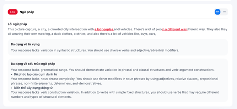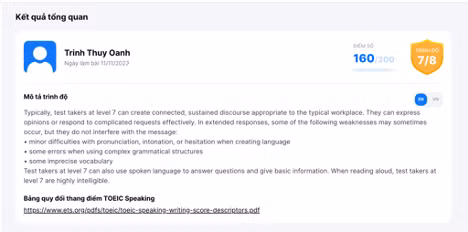 Ngoài ra, trí tuệ nhân tạo còn giúp người học nâng cấp bài làm lên một mức điểm cao hơn bằng cách gợi ý các cụm từ vựng, collocations (kết hợp từ) ăn điểm. Đặc biệt, khi luyện tập với phòng luyện Nói ảo TOEIC, người học sẽ được phân tích các lỗi phát âm chi tiết đến từng âm vị, giúp cải thiện khả năng nói của người học.