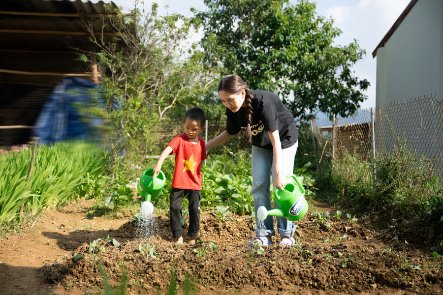 | Bên cạnh công trình Nhà bếp ăn, Hoa hậu Mai Phương còn góp phần xây dựng vườn rau trước khuôn viên trường với tên gọi Yako Farm. |