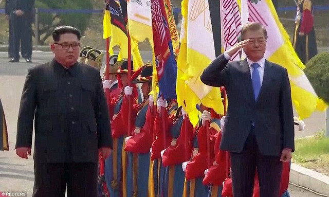 Lãnh đạo Triều Tiên đã bước qua đường biên giới và bắt tay thân mật với người lãnh đạo của quốc gia từng bị coi là kẻ thù. Sau đó, ông Kim và ông Moon đã đi cạnh nhau trong một lễ đón chào nồng nhiệt.