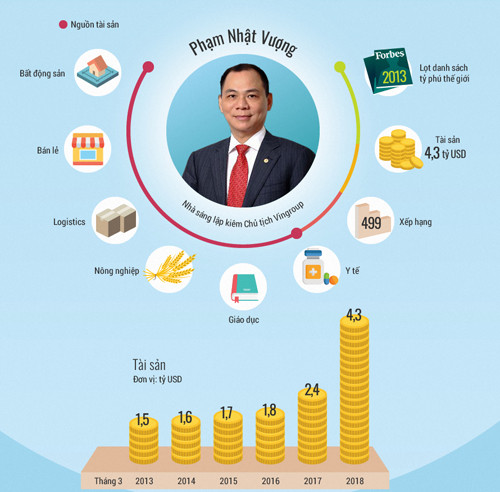Với ông Phạm Nhật Vượng, đây là năm thứ 6 liên tiếp ông có tên trong danh sách của Forbes, với tài sản 4,3 tỷ USD, đứng thứ 499 thế giới, tăng 1,9 tỷ USD so với năm ngoái. Xây dựng, bán, xây dựng tiếp – điệp khúc tạo nên sự thành công đột phá của Vingroup trong lĩnh vực bất động sản và của cá nhân tỷ phú Phạm Nhật Vượng hơn 17 năm từ ngày trở về Việt Nam. Tốc độ phát triển thần tốc trong mảng địa ốc đã đặt Vingroup ngang hàng với những nhà phát triển bất động sản hàng đầu trong khu vực.