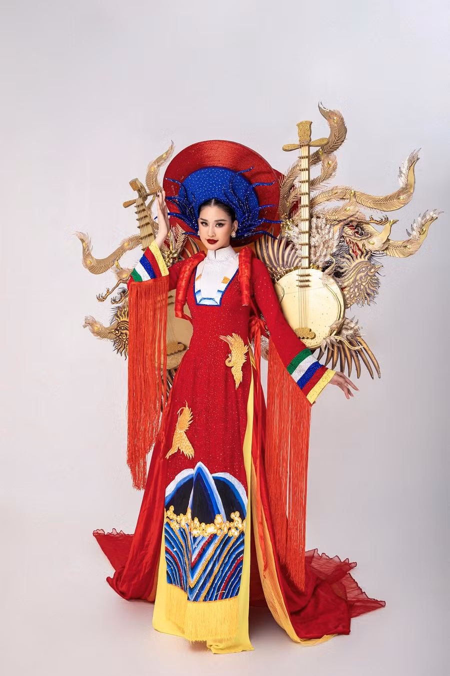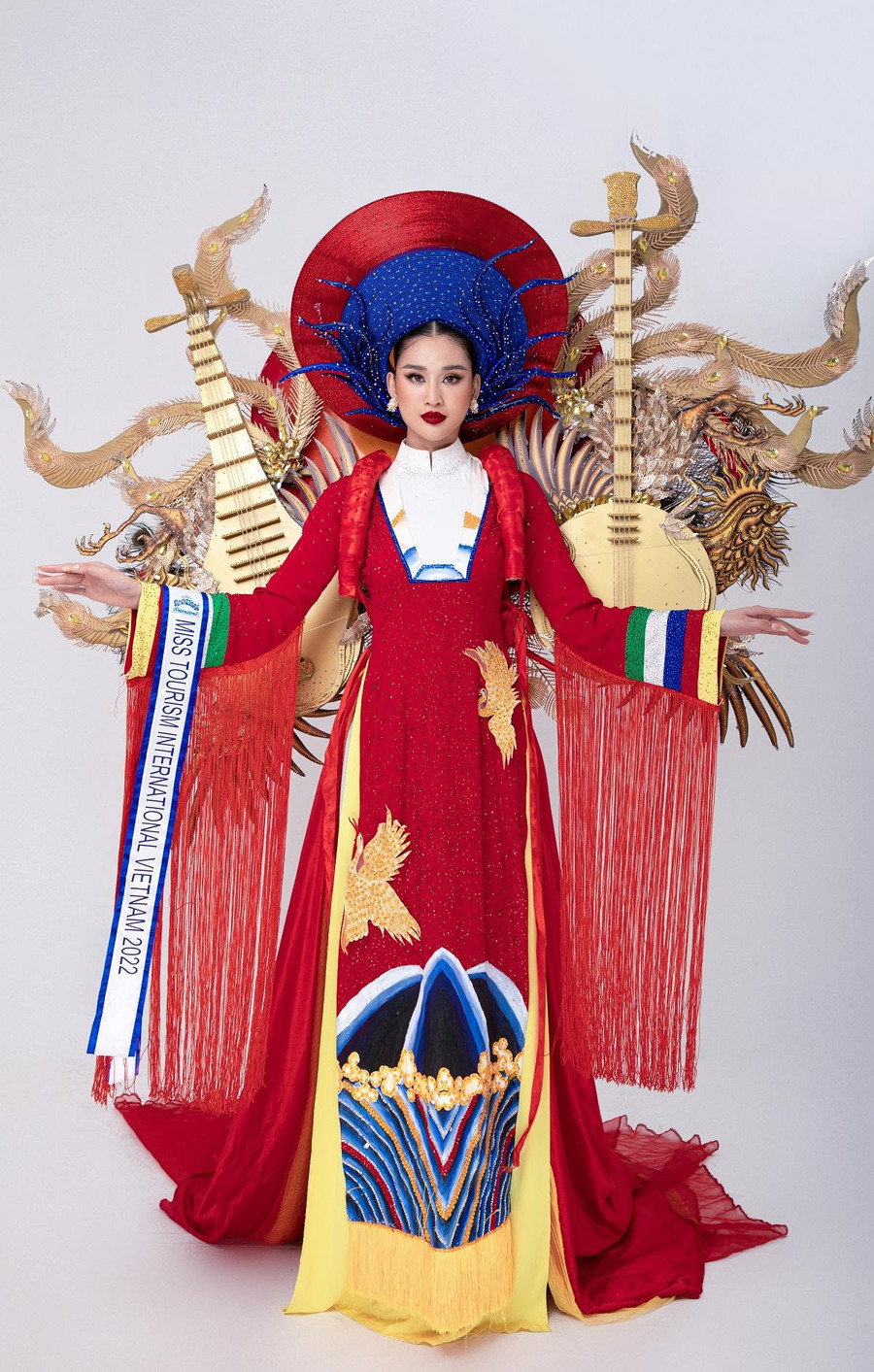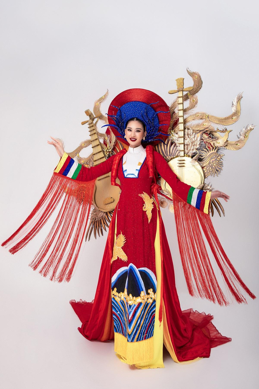 Lấy cảm hứng từ Nhã nhạc cung đình Huế - di sản phi vật thể và truyền thống của nhân loại được Unesco công nhận, bộ trang phục bao gồm áo dài mang vẻ đẹp của áo dài Nhật Bình đính kết lấp lánh mang đến hiệu ứng ánh sáng sân khấu cao, phần mấn với những chi tiết đôi chim phượng uốn lượn và phần khung phía sau với hình ảnh mặt trời với tông vàng gold toát lên sự quyền lực. Điểm thêm đó hai loại nhạc cụ là “đàn Nguyệt” và “đàn Tỳ Bà”.
