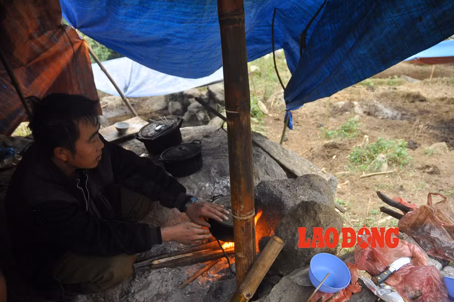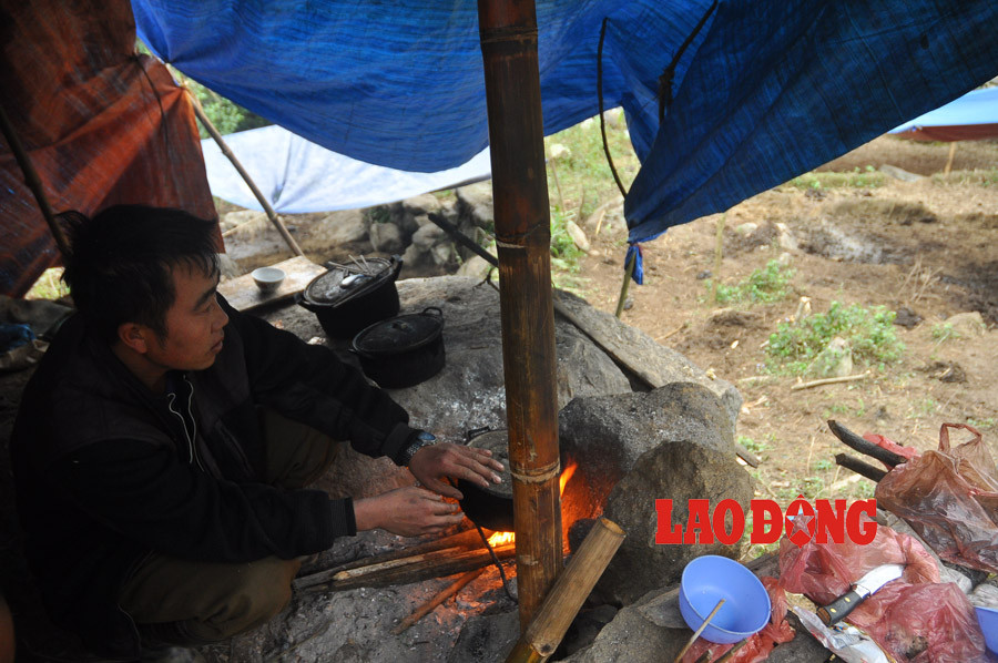 Cũng phải đưa đàn trâu đi đến nơi ấm áp hơn, anh Châu A Pó (thôn Chu Lìn 1, xã Trung Chải) đang sưởi ấm bên bếp dựng tạm.