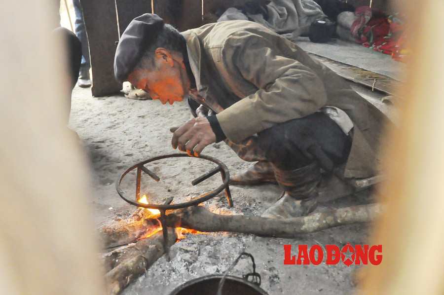Ông Châu A Măng, 67 tuổi, trú tại thôn Chu Lìn 1 (xã Trung Chải, Sa Pa) đang nhóm lửa sưởi ấm trong căn lều dựng tạm trên đồi để chăm sóc đàn trâu của gia đình.
