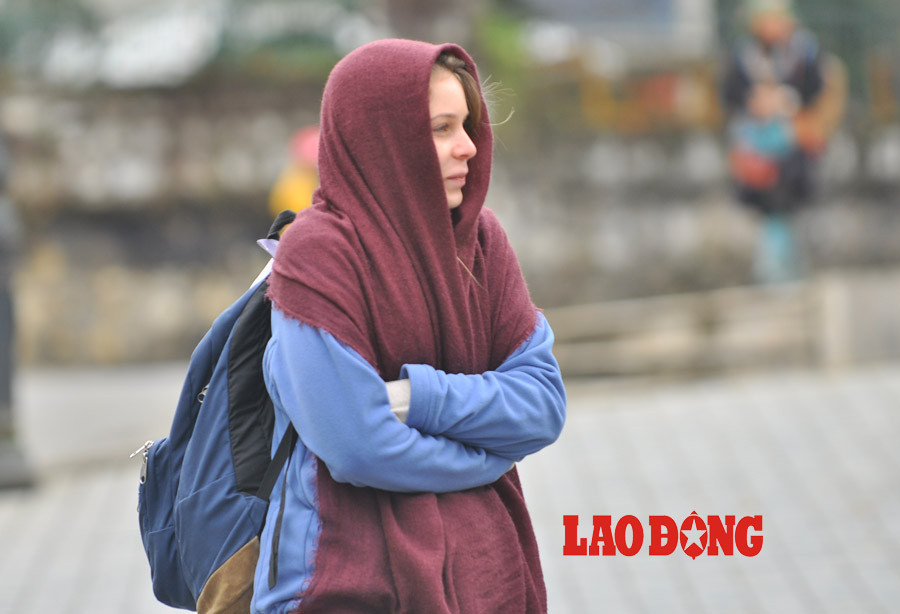 Du khách nước ngoài co ro trong giá lạnh ở Sa Pa.