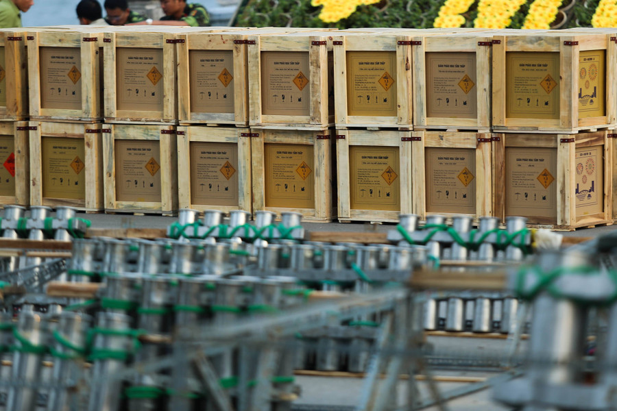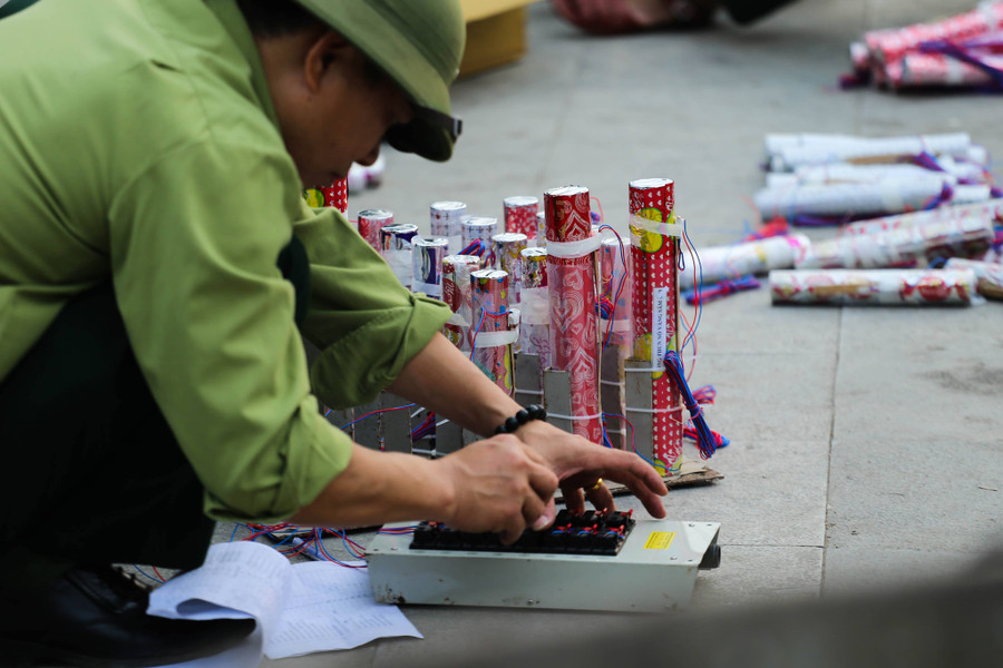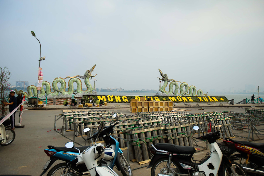 Tại trận địa pháo hoa khu vực quận Tây Hồ các chiến sĩ thuộc Bộ Tư lệnh Thủ Đô và Ban chỉ huy quân sự quận Tây Hồ đang lắp đặt trận địa pháo và sẽ bắn 500 quả pháo trong vòng 15 phút vào thời khác giao thừa chuyển giao giữa năm cũ và năm mới.