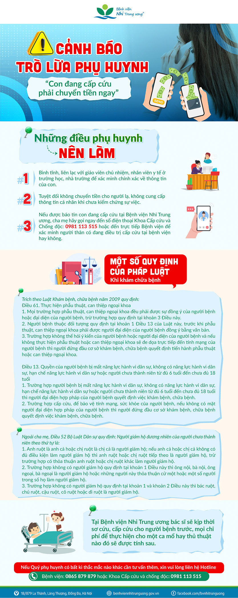 Bệnh viện Nhi Trung ương cho biết, lo lắng, hoảng hốt, bối rối là tâm trạng chung của các bậc phụ huynh nên khi nghe tin con mình gặp nguy hiểm, phụ huynh sẽ ngay lập tức đáp ứng yêu cầu để đảm bảo an toàn cho con.