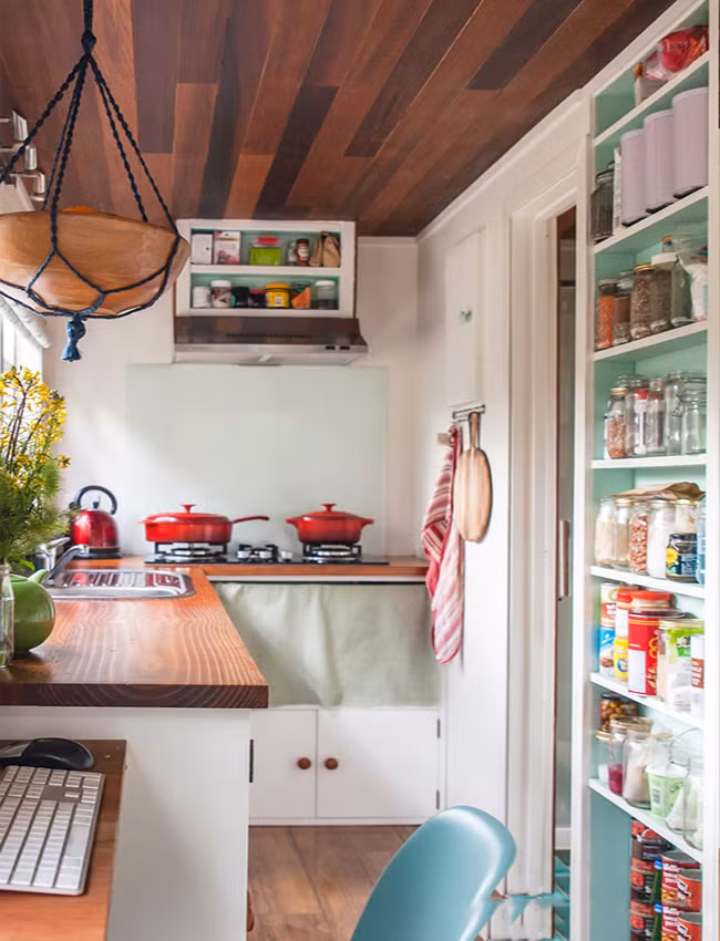 Góc bếp tuy nhỏ nhưng có thừa tủ chứa đồ cho khu vực này. Phía trên máy hút mùi được tận dụng làm tủ đựng các hộp da vị. Bên dưới là cả một hệ thống tủ kệ thỏa mãn nhu cầu lưu trữ các vật dụng nhà bếp.