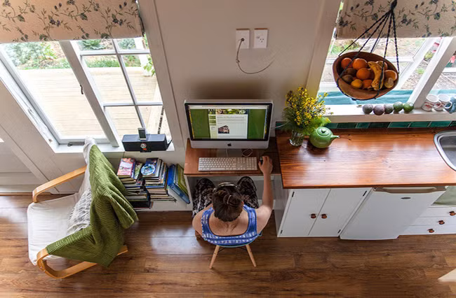 Không cần tốn nhiều diện tích, không gian làm việc được thiết kế đơn giản với chiếc bàn nhỏ cùng tông màu với bàn bếp và ghế ngồi. Ngay bên cạnh là giá để sách và không gian đọc sách tuyệt vời với chiếc ghế bành.