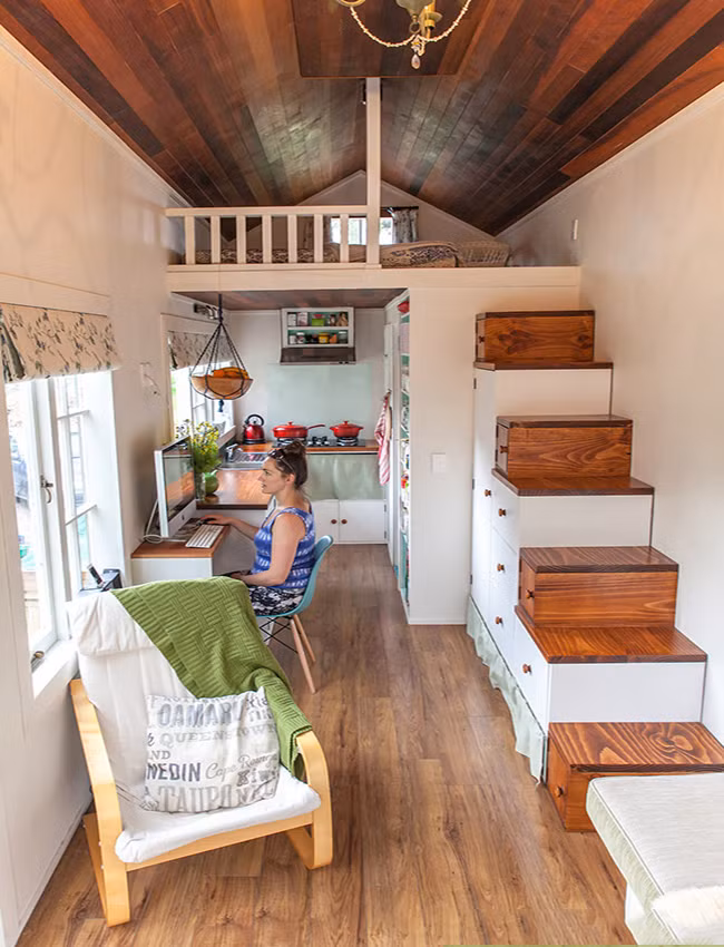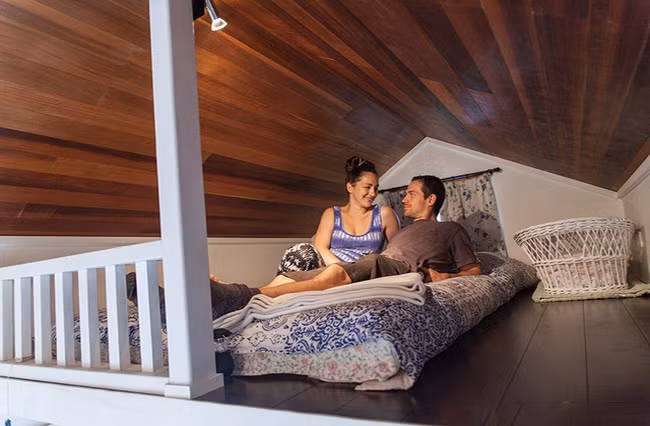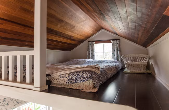 Khu vực nghỉ ngơi của chủ nhà là một gác xép nhỏ nằm trên khu vực bếp nấu và nhà vệ sinh.