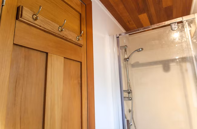 Lối dẫn lên gác xép là một cầu thang gỗ kết hợp tủ đựng đồ.