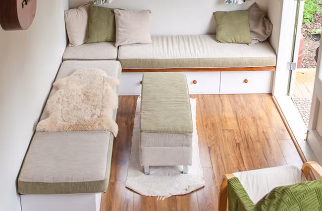 Từng góc nhỏ trong nhà điều được gia chủ tận dụng một cách triệt để. Bên dưới tấm đệm nơi phòng khách là những ngăn kéo lưu trữ những đồ dùng nhỏ của gia đình.