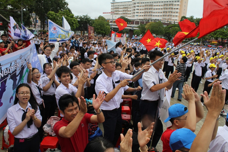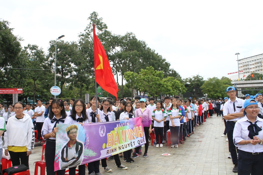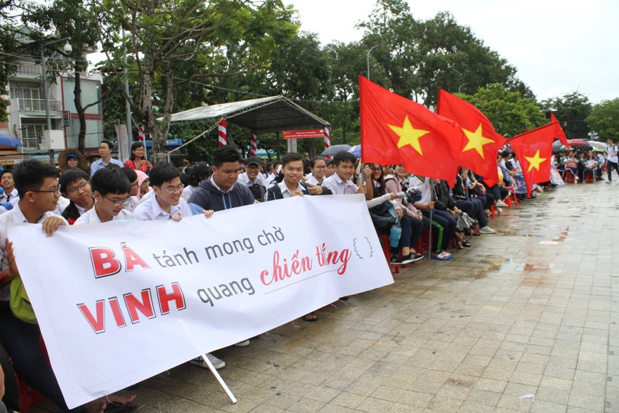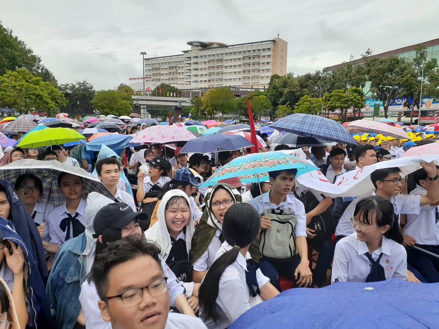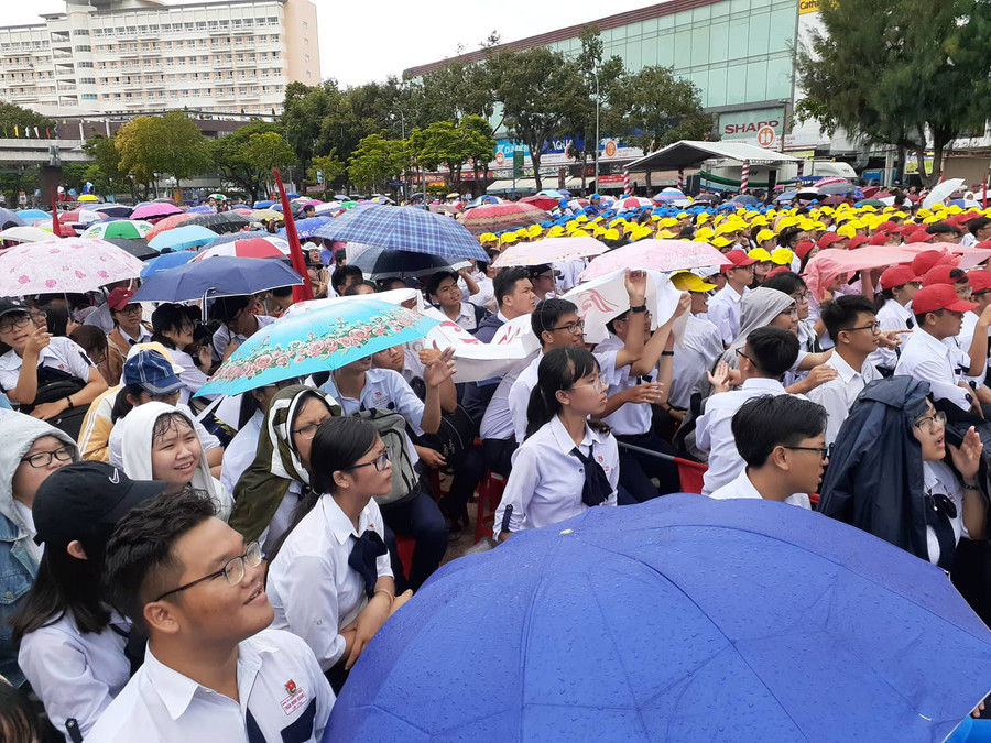 Không khí tại điểm cầu Cần Thơ tại Công viên Lưu Hữu Phước hết sức sôi động dù trời mưa rả rích. Tất cả đại biểu, các thầy cô giáo và học sinh đều chuẩn bị áo mưa đề phòng mưa lớn vẫn bám vị trí cổ vũ cho Bá Vinh.