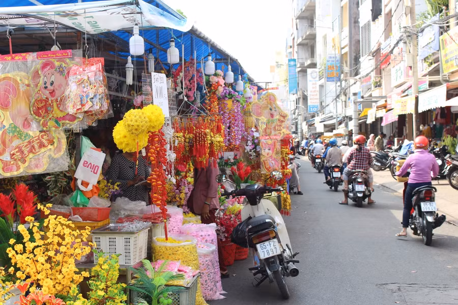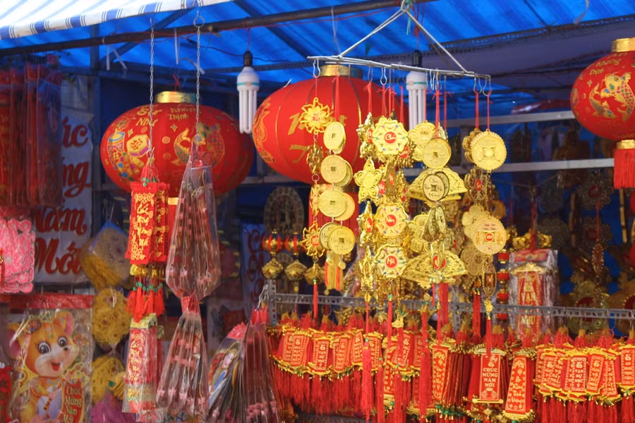 | Các cửa hàng bán đồ trang trí Tết cũng chen chân nhau bày bán. |