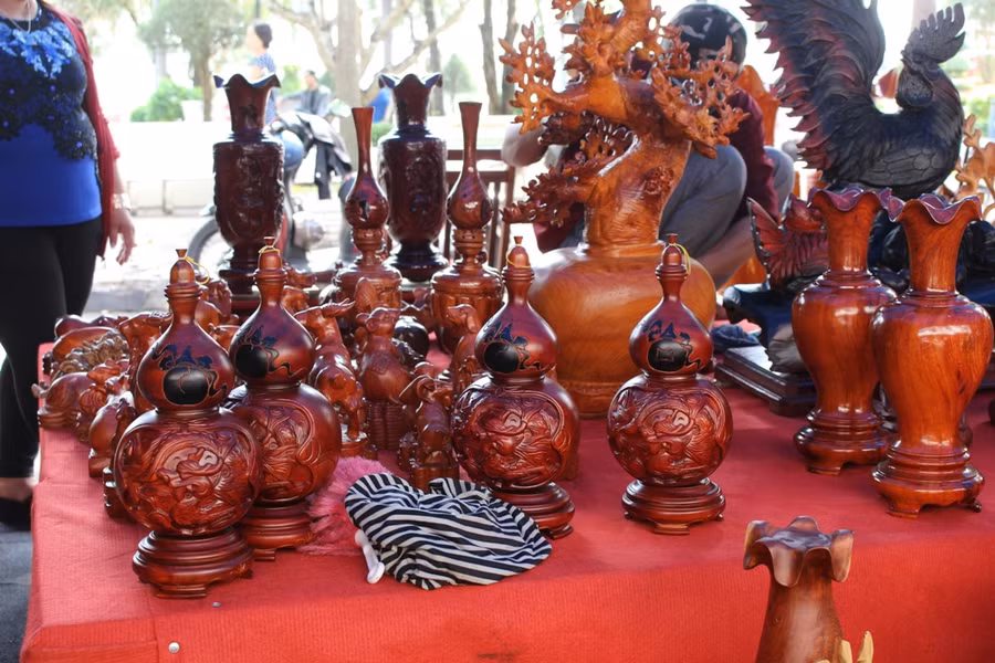 | Các loại đồ gỗ trang trí, phong thủy cũng tranh thủ góp mặt tại chợ Tết Cần Thơ. |
