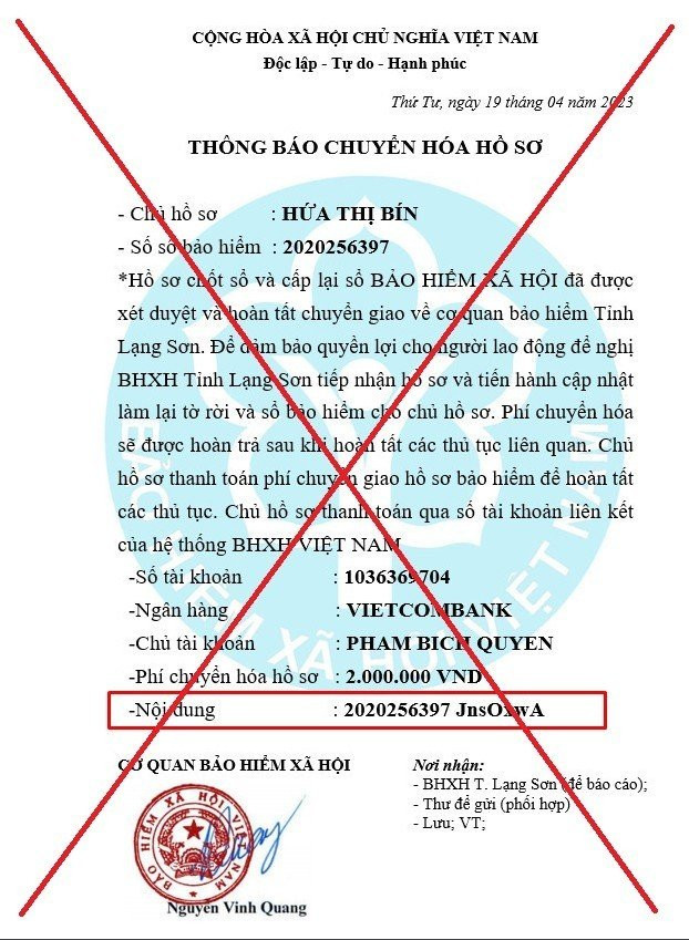 Sau khi chuyển khoản thành công, Zalo Nguyễn Linh gửi cho chị B. văn bản có nội dung “THÔNG BÁO CHỐT SỔ VÀ GỘP SỔ” được đóng dấu đỏ mang tên BHXH Việt Nam do Nguyễn Vinh Quang ký, đồng thời yêu cầu chị B. tiếp tục đóng thêm mức phí là 900.000 đồng để hoàn tất quá trình gộp sổ. Theo yêu cầu, chị B. tiếp tục chuyển số tiền này vào tài khoản lần trước do Zalo Nguyễn Linh cung cấp.