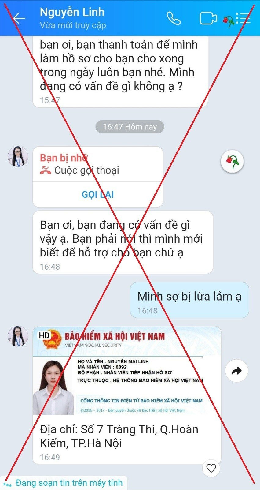Cụ thể, ngày 19/4/2023 do có nhu cầu cần gộp sổ BHXH, chị Hứa Thị B. (trú tại huyện Cao Lộc, tỉnh Lạng Sơn) đã lên mạng tìm kiếm dịch vụ làm hồ sơ nhanh. Sau đó, chị vào Fanpage Facebook có tên: “Giải đáp thắc mắc BHXH” để hỏi và được Fanpage Facebook này hướng dẫn liên hệ với nhân viên tư vấn qua Zalo https://zalo.me/0886763347 có tên Nguyễn Linh.