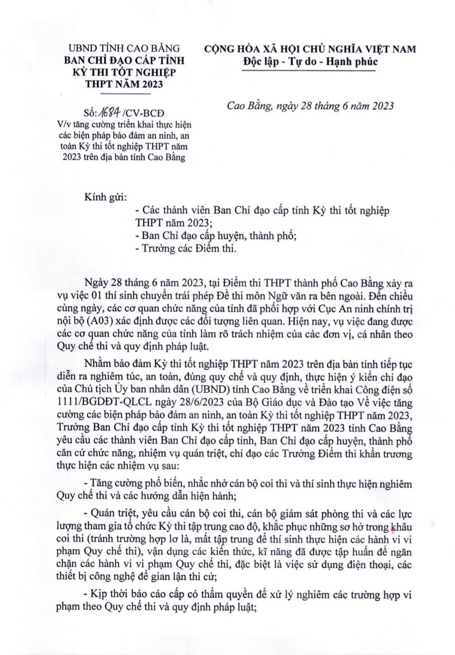 UBND tỉnh Cao Bằng vừa có công văn số 1684/CV-BCĐ về việc tăng cường triển khai thực hiện các biện pháp bảo đảm an ninh, an toàn Kỳ thi tốt nghiệp trên địa bàn tỉnh Cao Bằng nêu trong ngày 28 tháng 6 năm 2023, tại Điểm thi THPT thành phố Cao Bằng xảy ra vụ việc 1 thí sinh chuyển trái phép Đề thi môn Ngữ văn ra bên ngoài. Đến chiều cùng ngày, các cơ quan chức năng của tỉnh đã phối hợp với Cục An ninh chính trị nội bộ (A03) xác định được các đối tượng liên quan. Hiện nay, vụ việc đang được các cơ quan chức năng của tỉnh làm rõ trách nhiệm của các đơn vị, cá nhân theo Quy chế thi và quy định pháp luật.