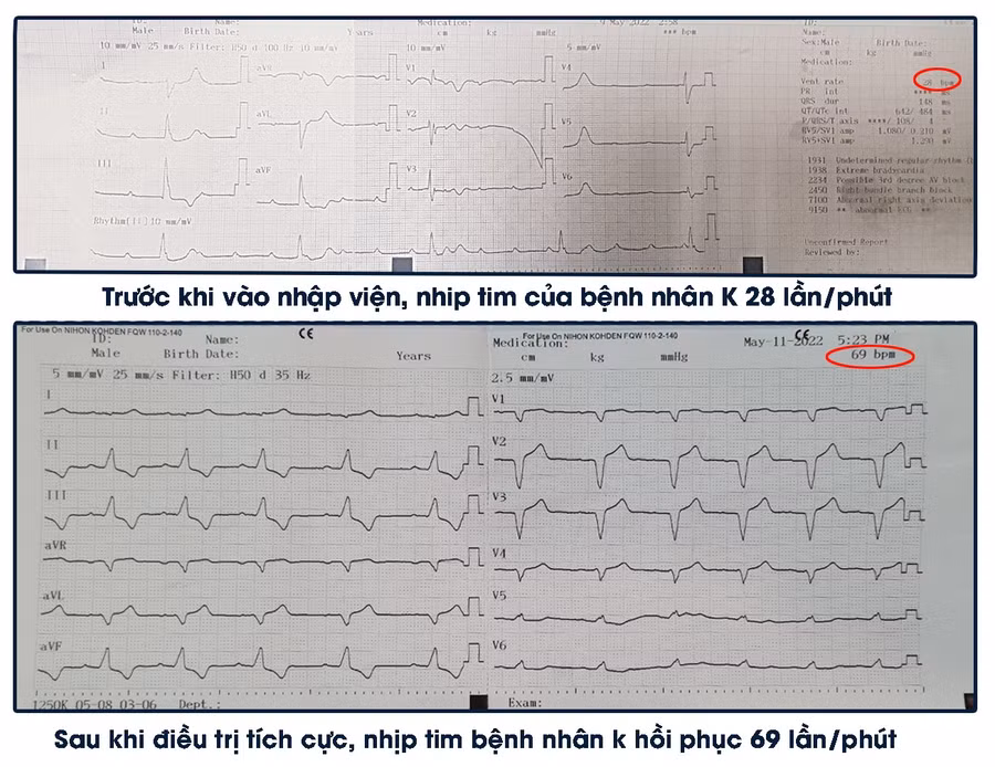 Sau khi được sơ cứu, và đặt máy tạo nhịp tạm thời, nhịp tim bệnh nhân được duy trì ở mức bình thường, huyết động cải thiện.