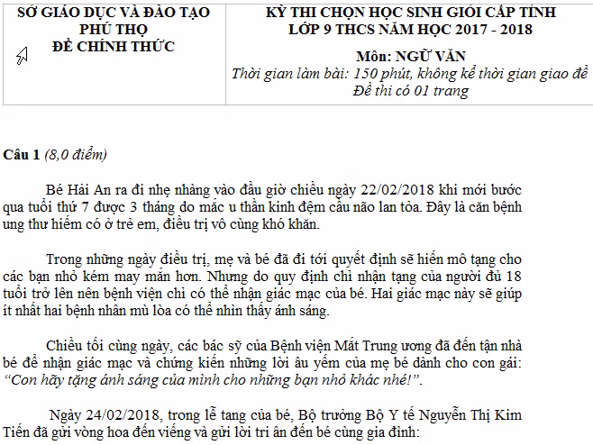 | Đề Ngữ văn thi học sinh giỏi cấp tỉnh lớp 9 năm học 2017 - 2018 của Phú Thọ |