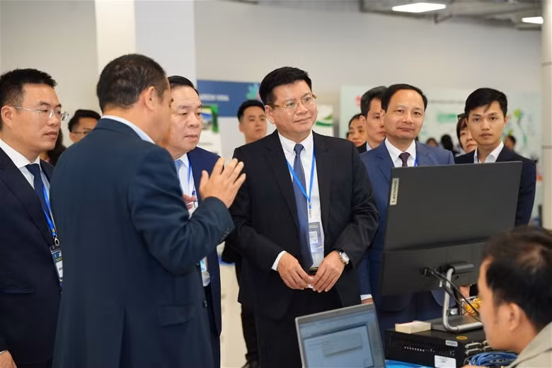PGS.TS. Đinh Văn Châu - Hiệu trưởng Trường Đại học Điện lực cùng đại biểu tham quan các gian hàng tại triển lãm.