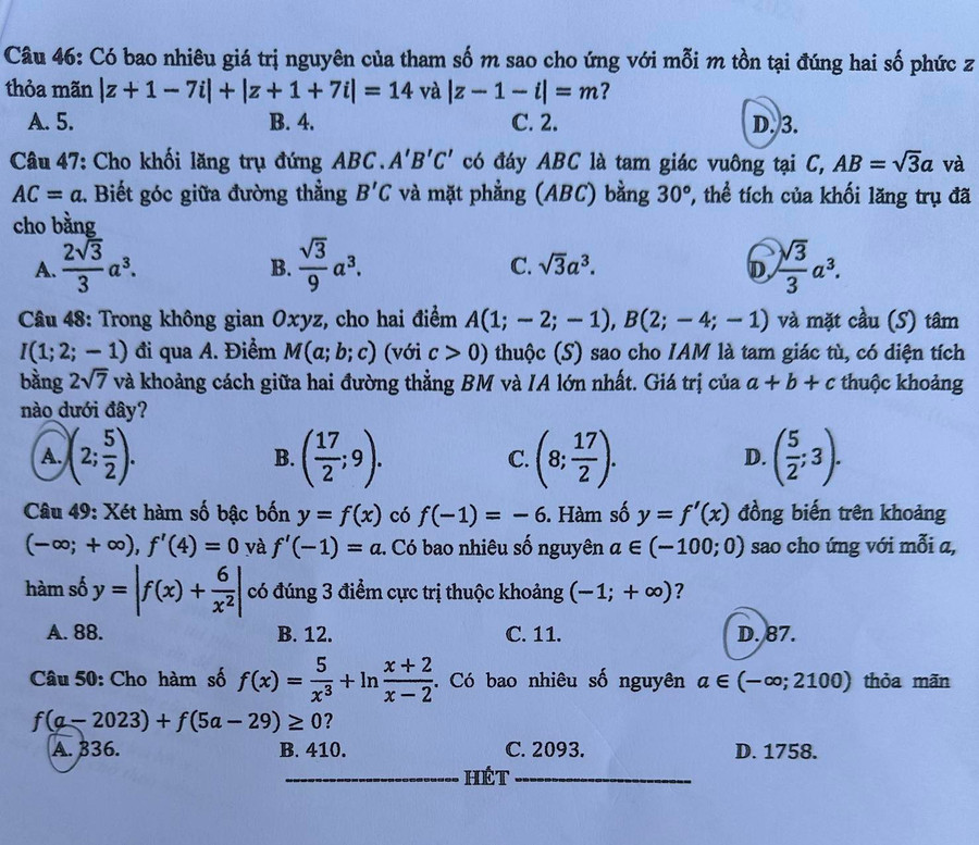 Học sinh mức độ trung bình khá sẽ dễ dàng làm được 7,4 điểm (nhiều câu có thể nhìn đề và chọn được đáp án luôn). Những câu vận dụng cao từ 41, 42, 48, 49, 50 thuộc các chủ đề Số phức, Bất phương trình mũ – logarit, hình Oxyz và tích phân.
