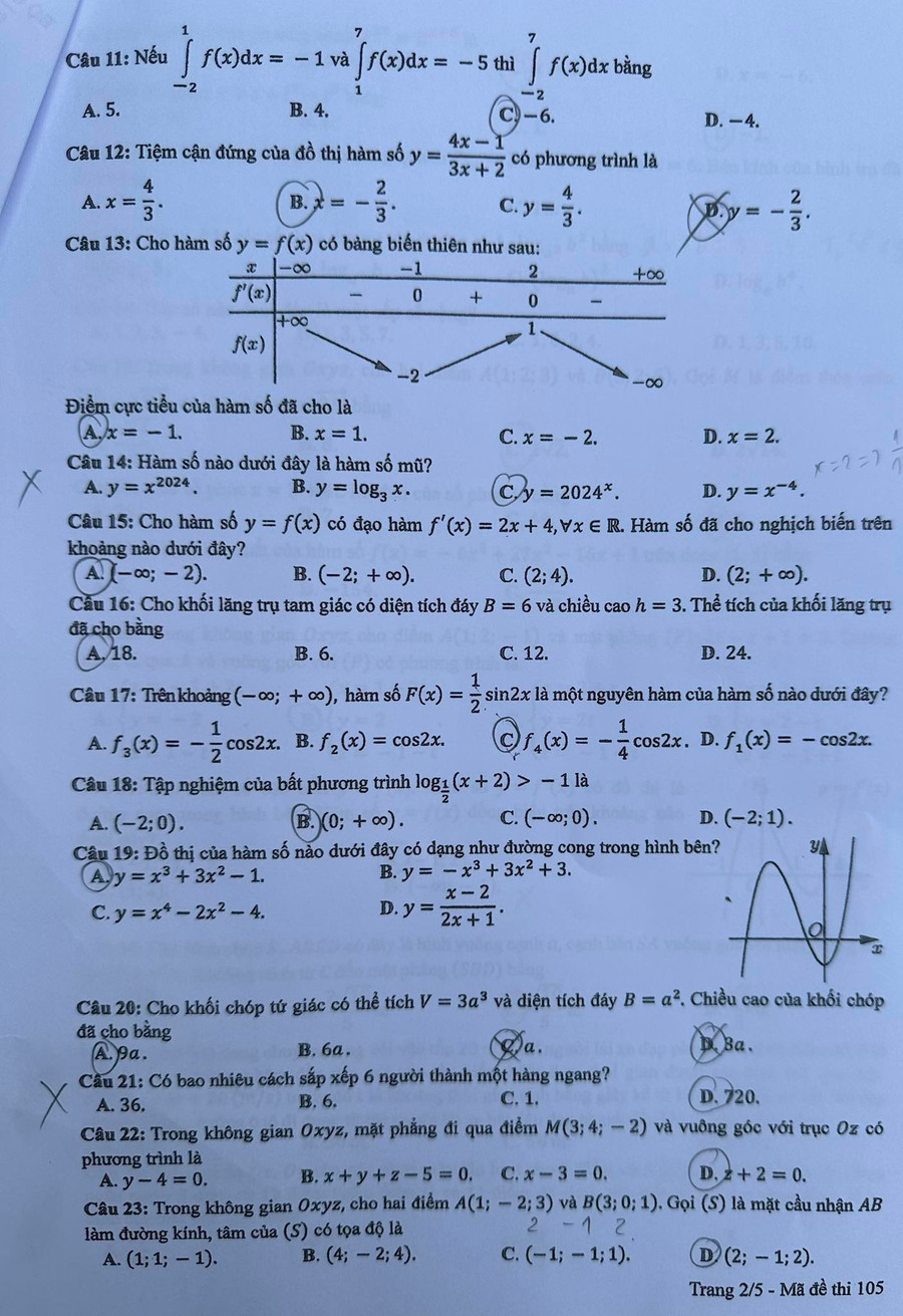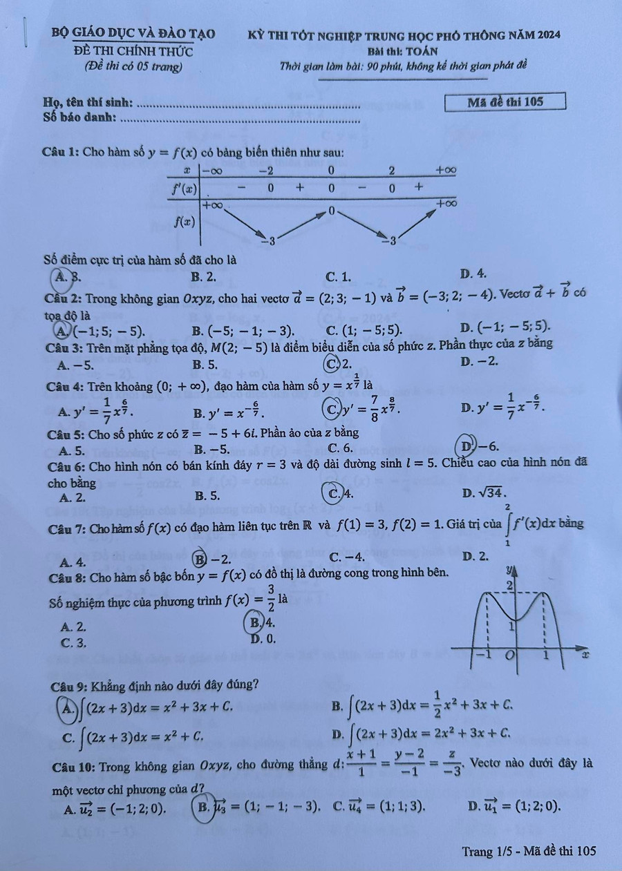 Đề có 5 câu hỏi mang tính phân loại và nằm ở phần kiến thức lớp 12 thuộc các chủ đề Số phức, hàm số, mũ – logarit, hình Oxyz và nguyên hàm – tích phân (tương tự đề tham khảo 2024).
