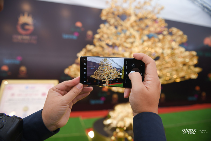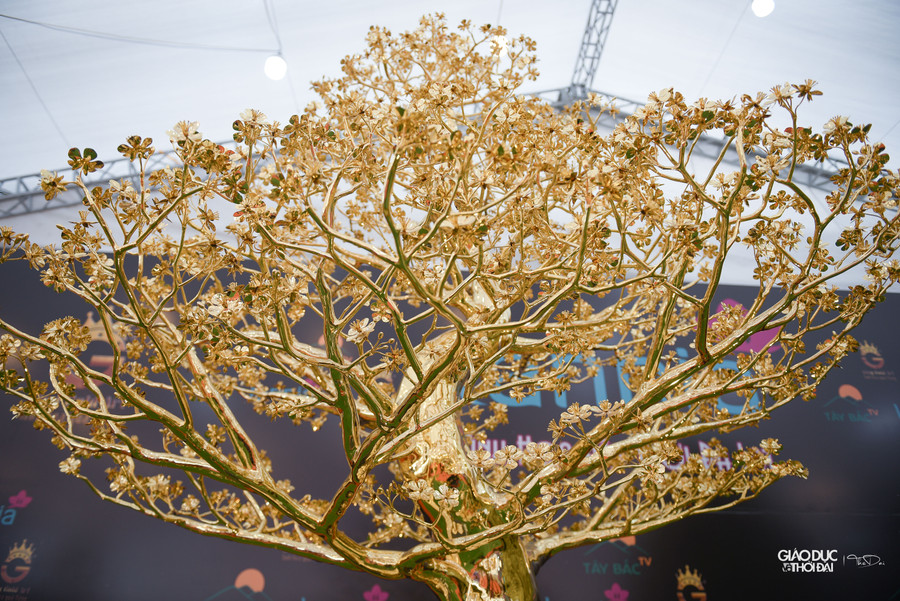 | Cây mai mạ vàng có chiều cao 3 m, khối lượng 288 kg được làm từ đồng mạ vàng 24K. |