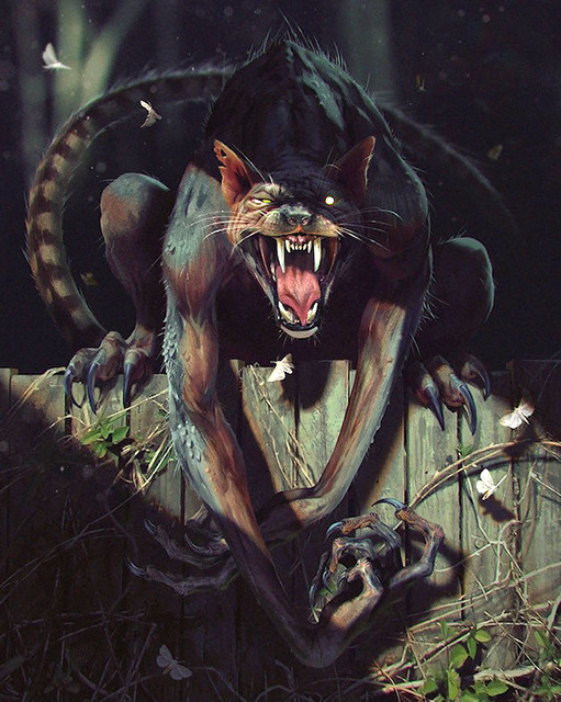 Trên người nó phủ đầy lông thô, tứ chi có móng vuốt, chiếc đuôi dài mỏng mảnh, khuôn mặt dường như trộn lẫn giữa người và mèo, với cặp mắt vàng rực sáng.
