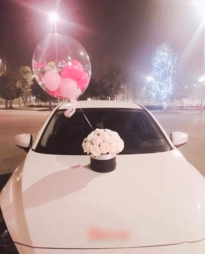 Chiếc xe ô tô được trang trí khá lãng mạn và đoạn tin nhắn của cả 2 sau buổi hẹn hò.