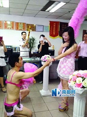 Hôm 14/5, Lian đã quyết định diện bikini 2 mảnh màu hồng, cầm theo một bó hoa, đi bộ 2 km tới văn phòng cô gái và quỳ xuống cầu hôn trước sự chứng kiến của mọi người.