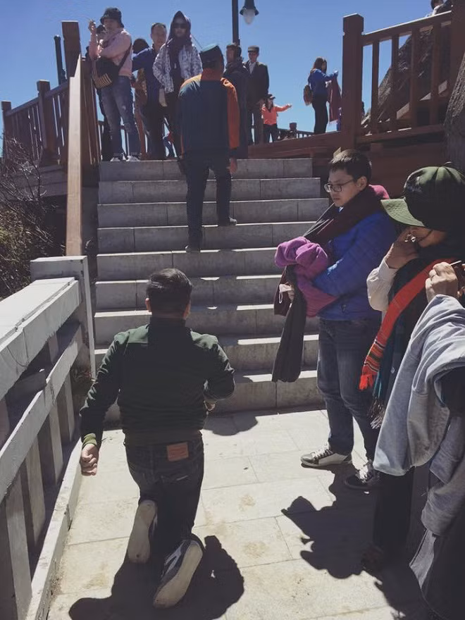 Trên đường đi, mọi người không ngớt trầm trồ và ngạc nhiên với một thằng cha lên đỉnh bằng đầu gối. Có người chụp ảnh, có người vỗ tay nói động viên “cố lên, còn chút nữa là tới thôi”. Mọi người càng cổ vũ thì tôi càng không thể bỏ cuộc được, phải lên tới nơi. Và thế là lại tiếp tục từng bước một.