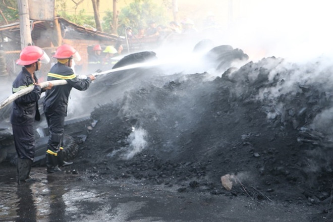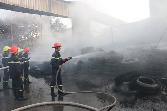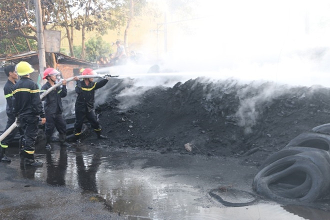 | Hiện trường vụ cháy kho phế liệu chứa lốp xe. |