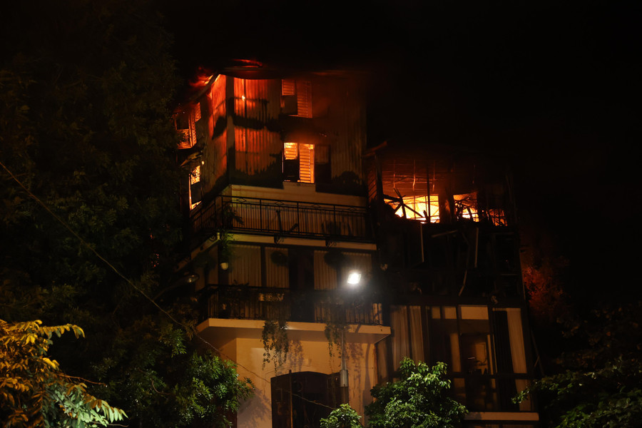 | Hiện trường cháy lớn giữa đêm tại phố Hàng Cót, đám cháy đã lan sang ít nhất 2 ngôi nhà bên cạnh. |