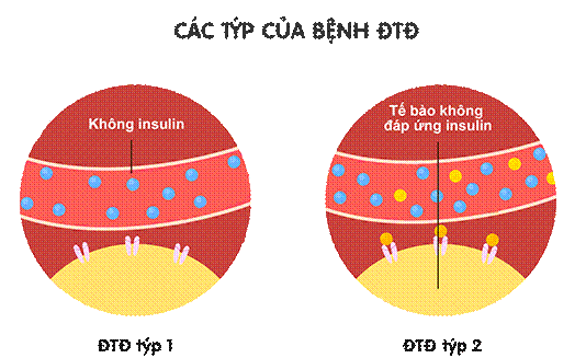 1/ ĐTĐ týp1 hay ĐTĐ phụ thuộc insulin, thường gặp ở tuổi trẻ, tuổi vị thành niên. Nó thường kết hợp với các bệnh tự miễn khác như bệnh basedow, bệnh viêm tuyến giáp tự miễn hay bệnh Addison. Cũng có thể có ĐTĐ týp 1 không rõ nguyên nhân (hay gặp ở châu Phi hoạc châu Á).