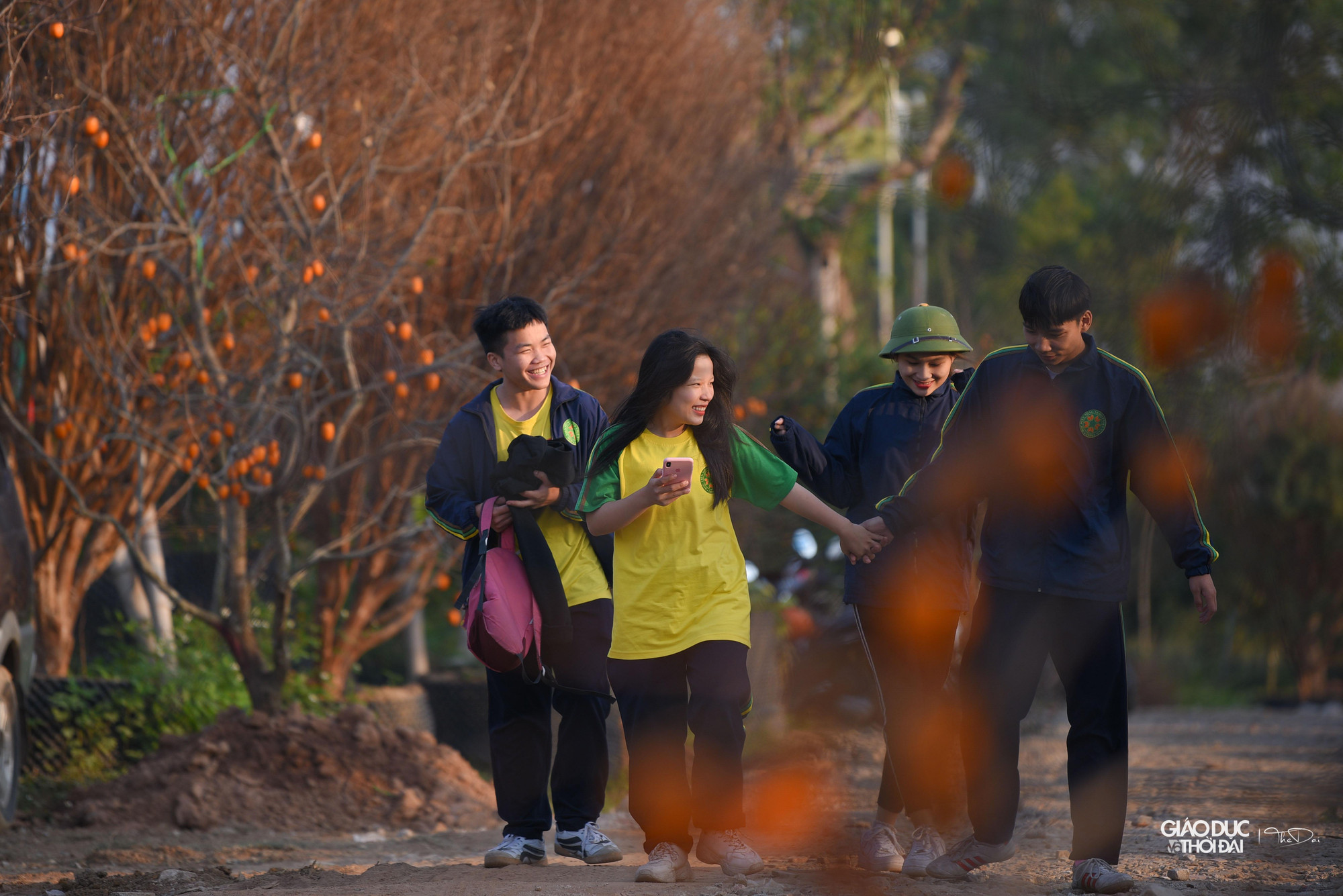 | Bạn Thủy Nguyên (Gia Lâm) cho biết: "Cuối năm công việc rất bận nên không thể đi Mộc Châu để chụp ảnh với hồng được, khi biết ngay khu vực mình sinh sống có con đường hồng, mình và bạn bè đã tranh thủ giờ trưa để ra chụp hình". |