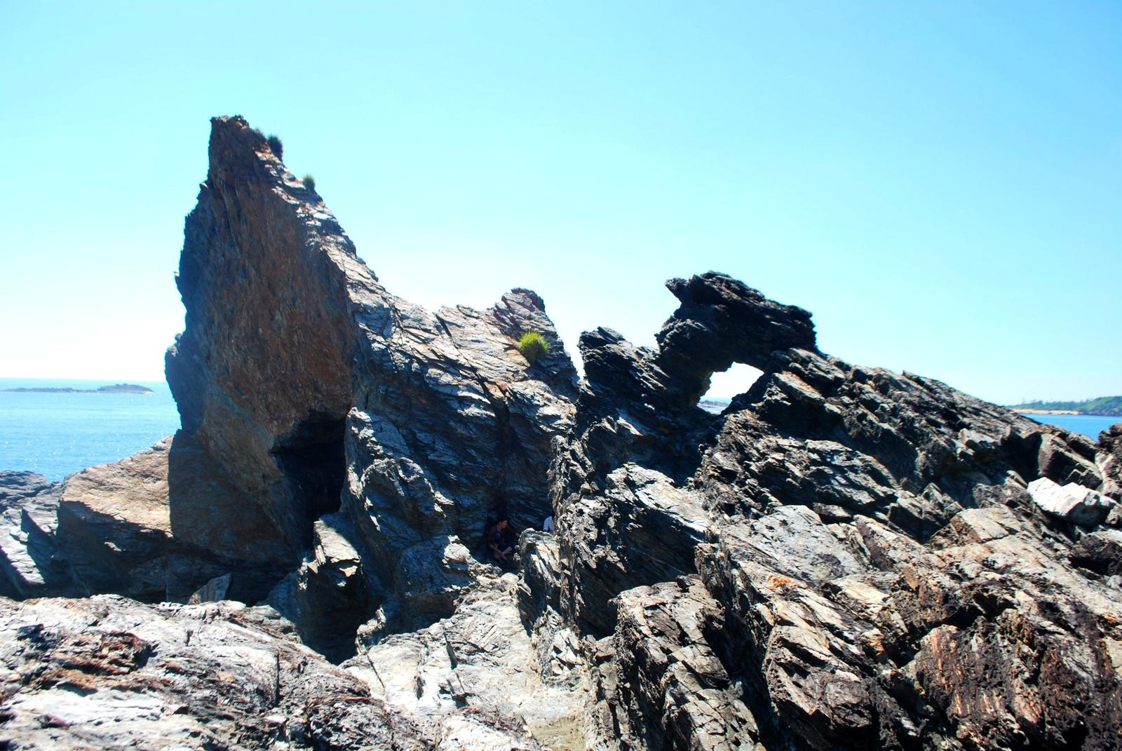 Trên bề mặt của những ghềnh đá đen, có nơi nổi lên những đường vân kỳ dị màu trắng hay những “hạt đá” màu trắng, vàng khảm trên nền đá đen trông rất độc đáo cùng với những “hoa văn họa tiết” trông khá huyền bí. Trời và biển nơi đây một màu xanh nhức mắt.