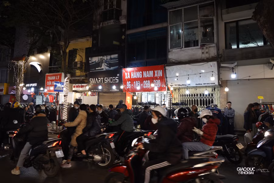 Tối 20/1 (29 Tết), hàng loạt các cửa hàng kinh doanh thời trang trên phố Hàng Bông (quận Hoàn Kiếm, Hà Nội) treo biển giảm giá nhân dịp cuối năm, thu hút lượng lớn người dân tập trung mua sắm.