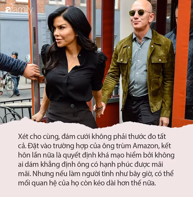 Xét cho cùng, đám cưới không phải thước đo tất cả. Đặt vào trường hợp của ông trùm Amazon, kết hôn lần nữa là quyết định khá mạo hiểm bởi không ai dám khẳng định ông có hạnh phúc được mãi mãi. Nhưng nếu làm người tình như bây giờ, có thể mối quan hệ của họ còn kéo dài hơn thế nữa.