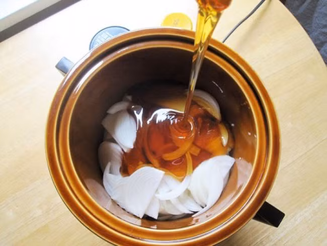 2, Cho củ hành đã chẻ vào một cái bát có đáy sâu hoặc cho vào tô lớn, đổ mật ong lên củ hành và dùng giấy bạc hoặc nắp đậy phủ lên trên miệng bát.