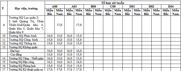 Ban tuyển sinh quân sự lưu ý các trường: Học viện Biên phòng, Trường Sĩ quan Lục quân 2 tuyển sinh thí sinh phía Nam theo từng quân khu gồm: 2 tỉnh Quảng Trị, Thừa Thiên-Huế/Quân khu 4, Quân khu 5, Quân khu 7, Quân khu 9;