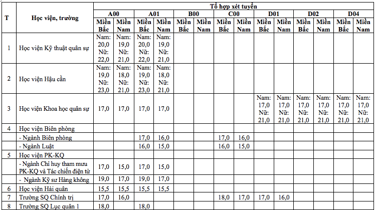 Theo đó, điểm sàn xét tuyển vào 17 trường Quân đội dao động từ 15 đến 23 điểm. Thí sinh nữ ở miền Bắc đăng ký xét tuyển vào Học viên hậu cần có điểm sàn 23 điểm- đây cũng là mức cao nhất.