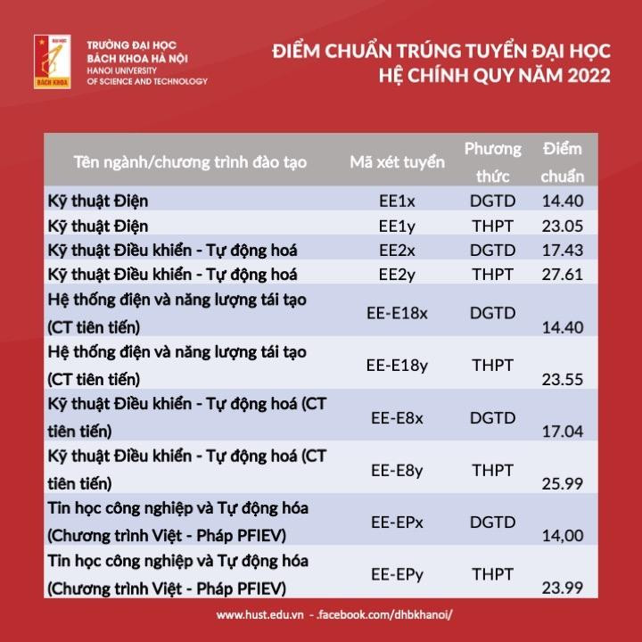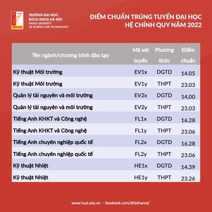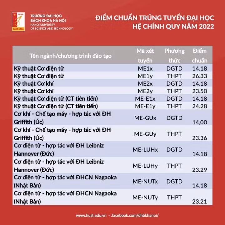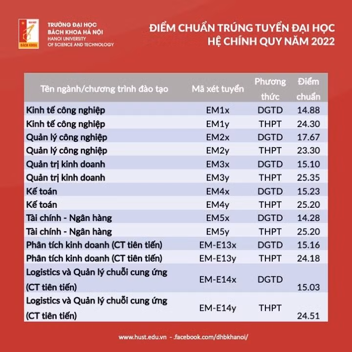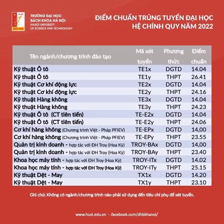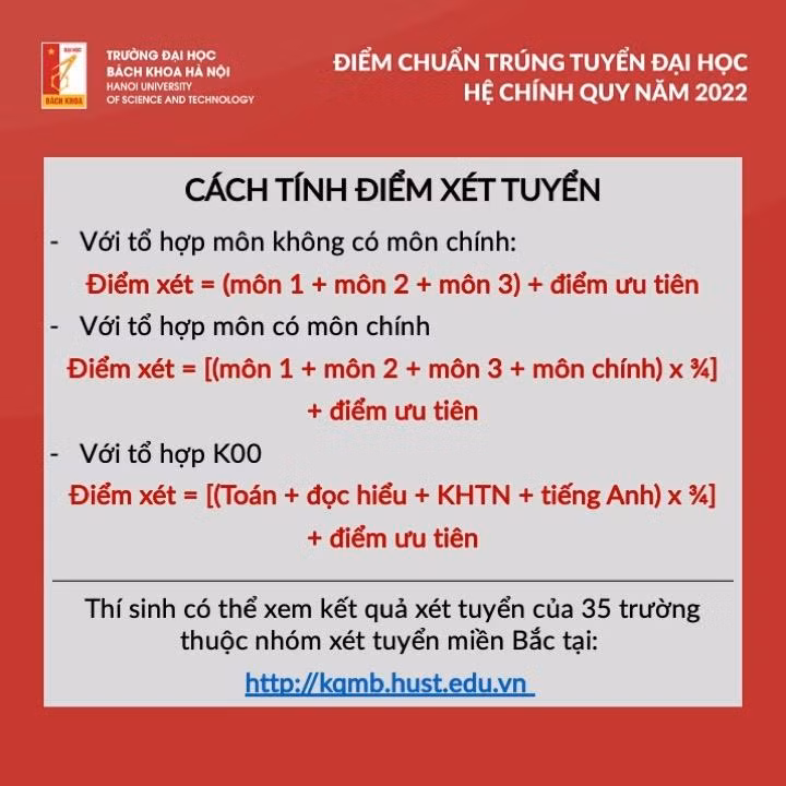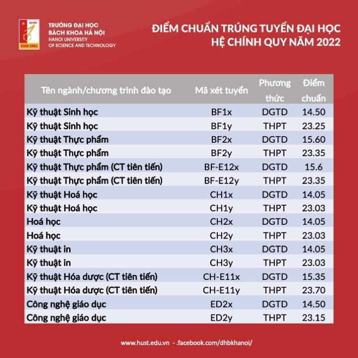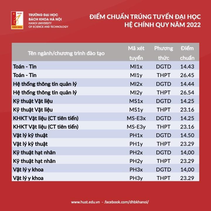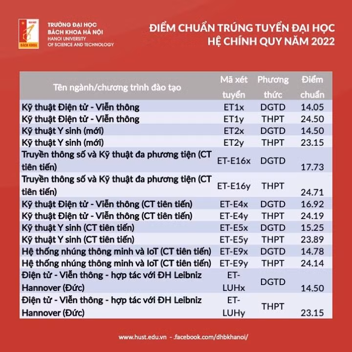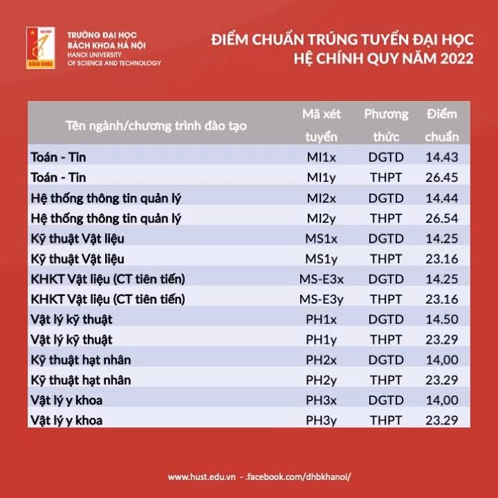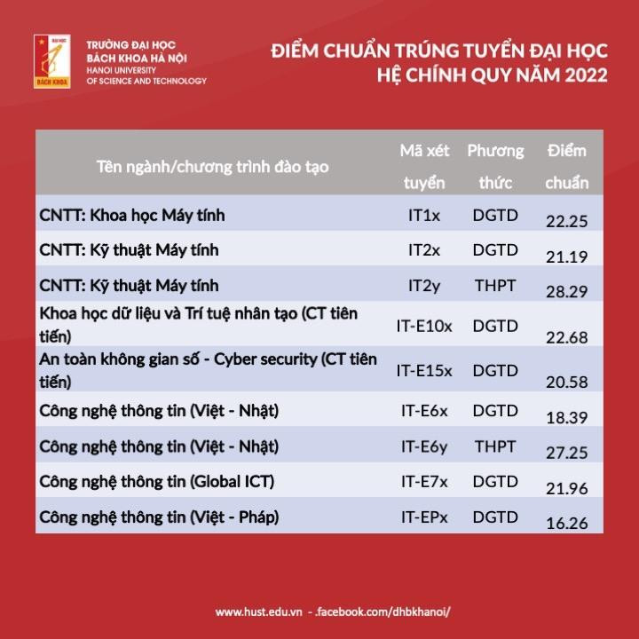 Điểm chuẩn trường Đại học Bách khoa Hà Nội 2022 cụ thể như sau: