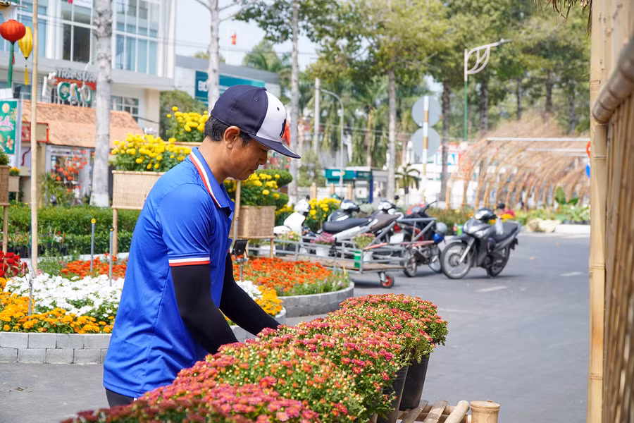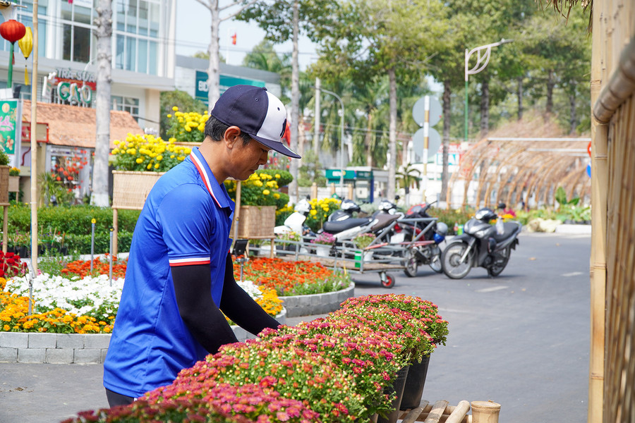| Công nhân đang hoàn tất những công đoạn chuẩn bị trước giờ khai mạc không gian đường hoa. |