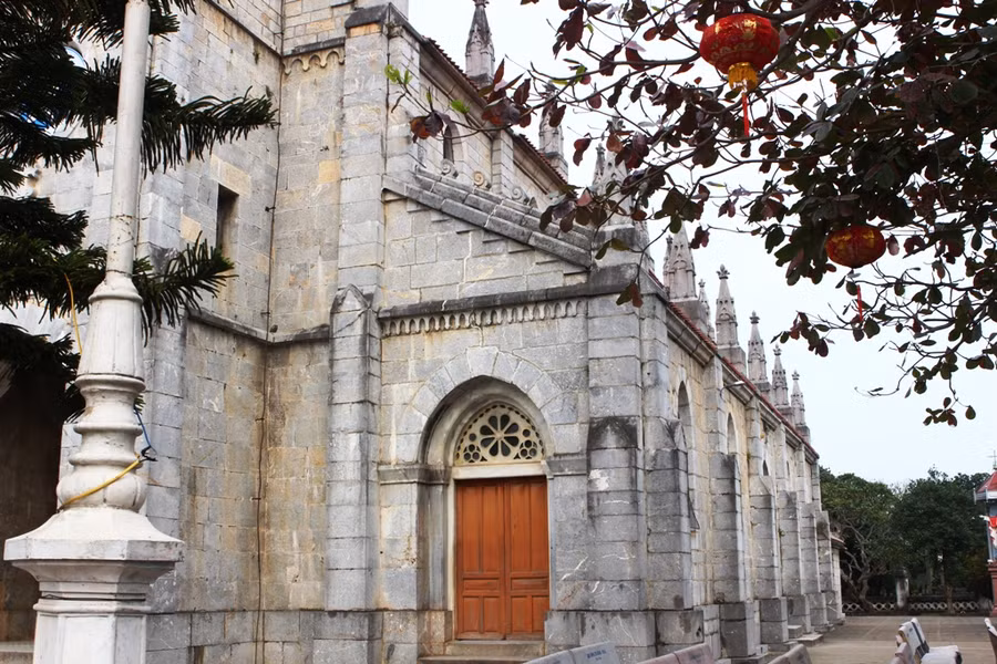 Có lịch sử hơn 100 năm, nhà thờ đá cổ kính, với những bụi dương xỉ mọc trong kẽ đá