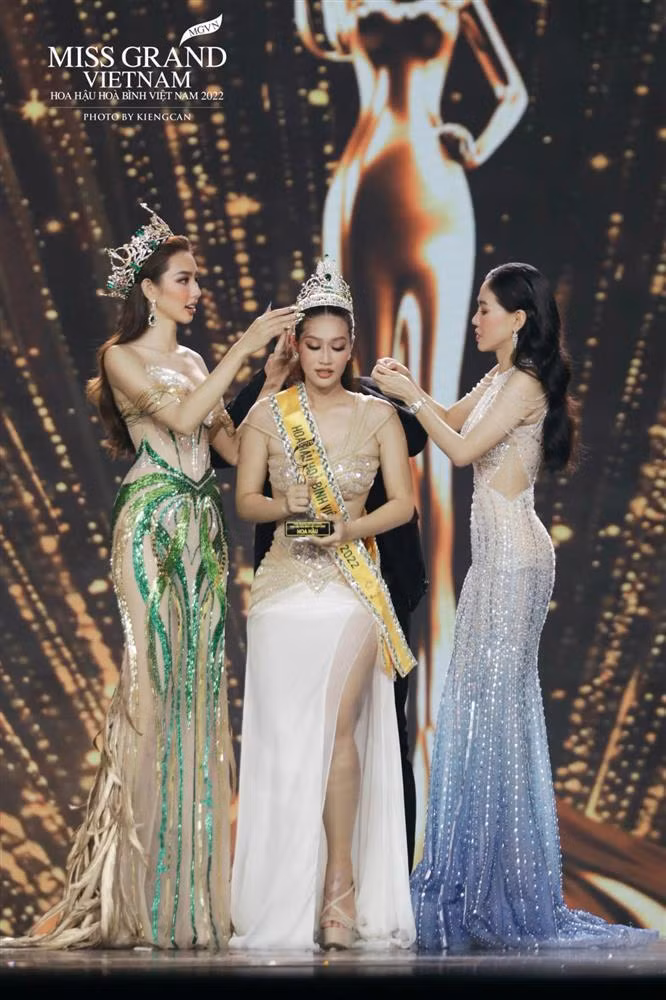 Khoảnh khắc Đoàn Thiên Ân nhận vương miện từ Miss Grand Vietnam 2021 – Nguyễn Thúc Thùy Tiên.