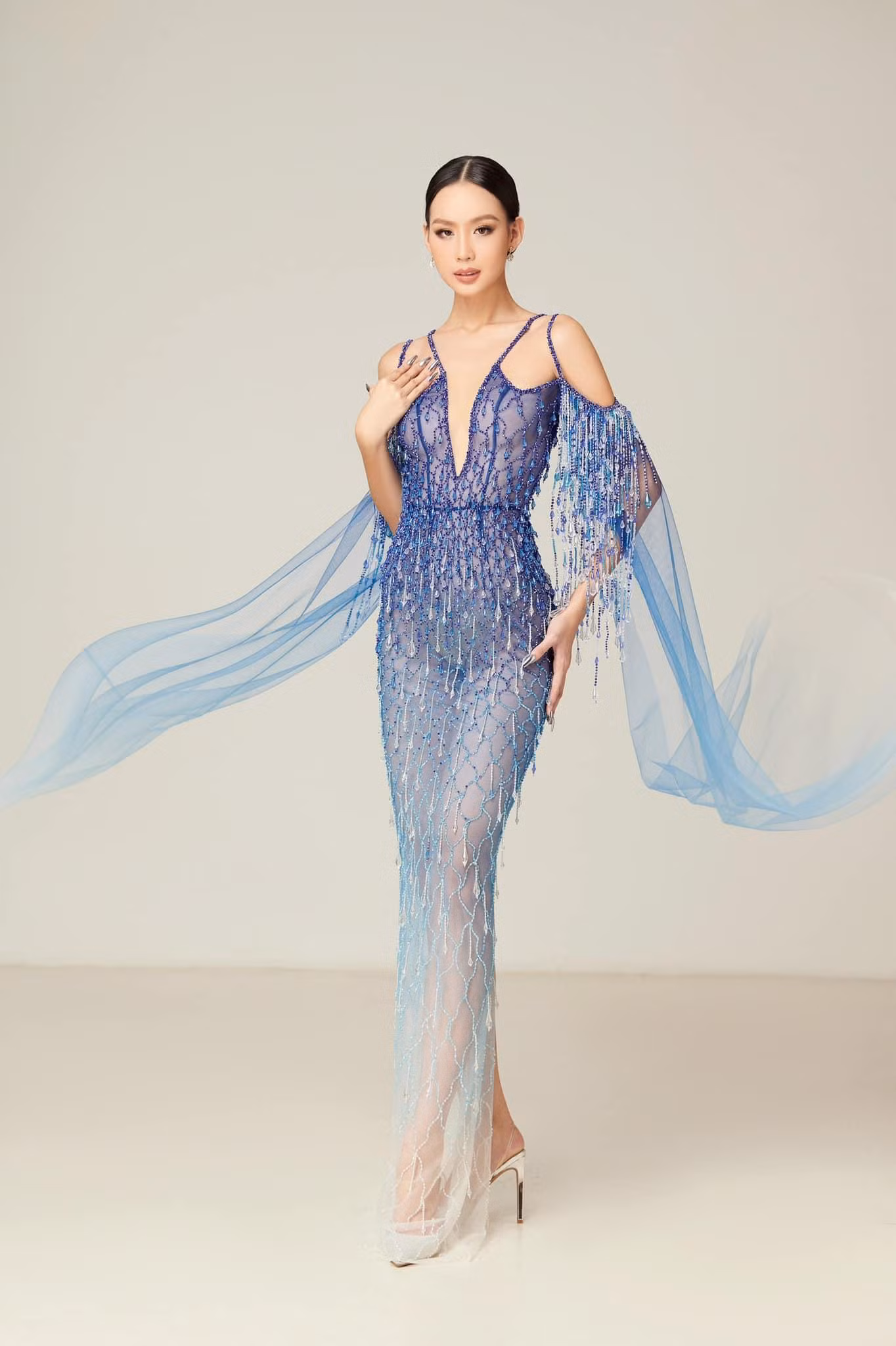 | Nàng hậu nổi bật trong những bộ đầm có thiết kế xẻ tà cao khoe khéo đôi chân dài. |