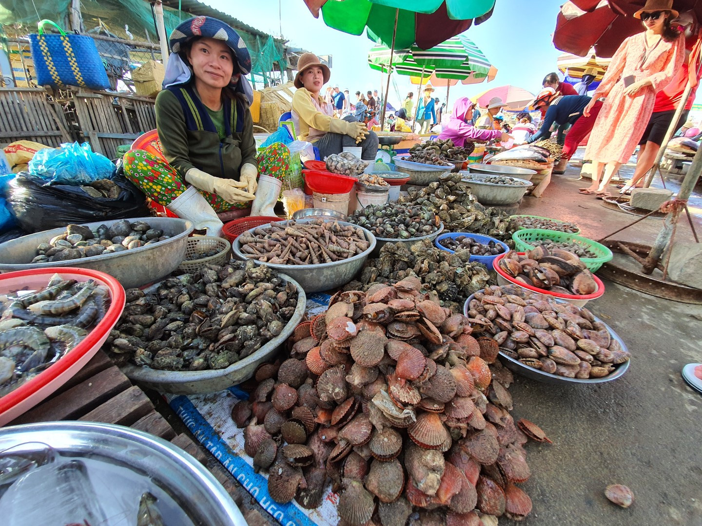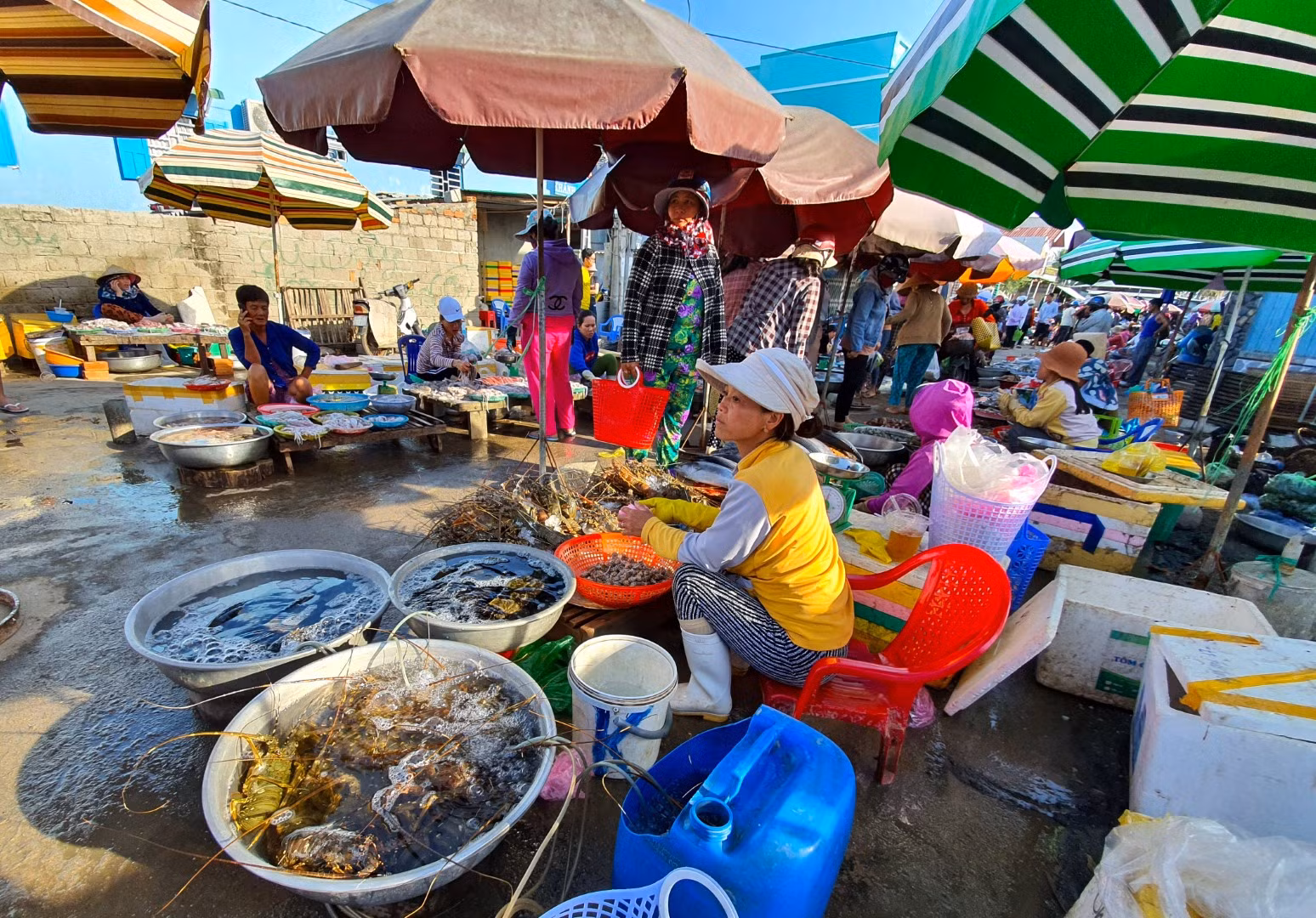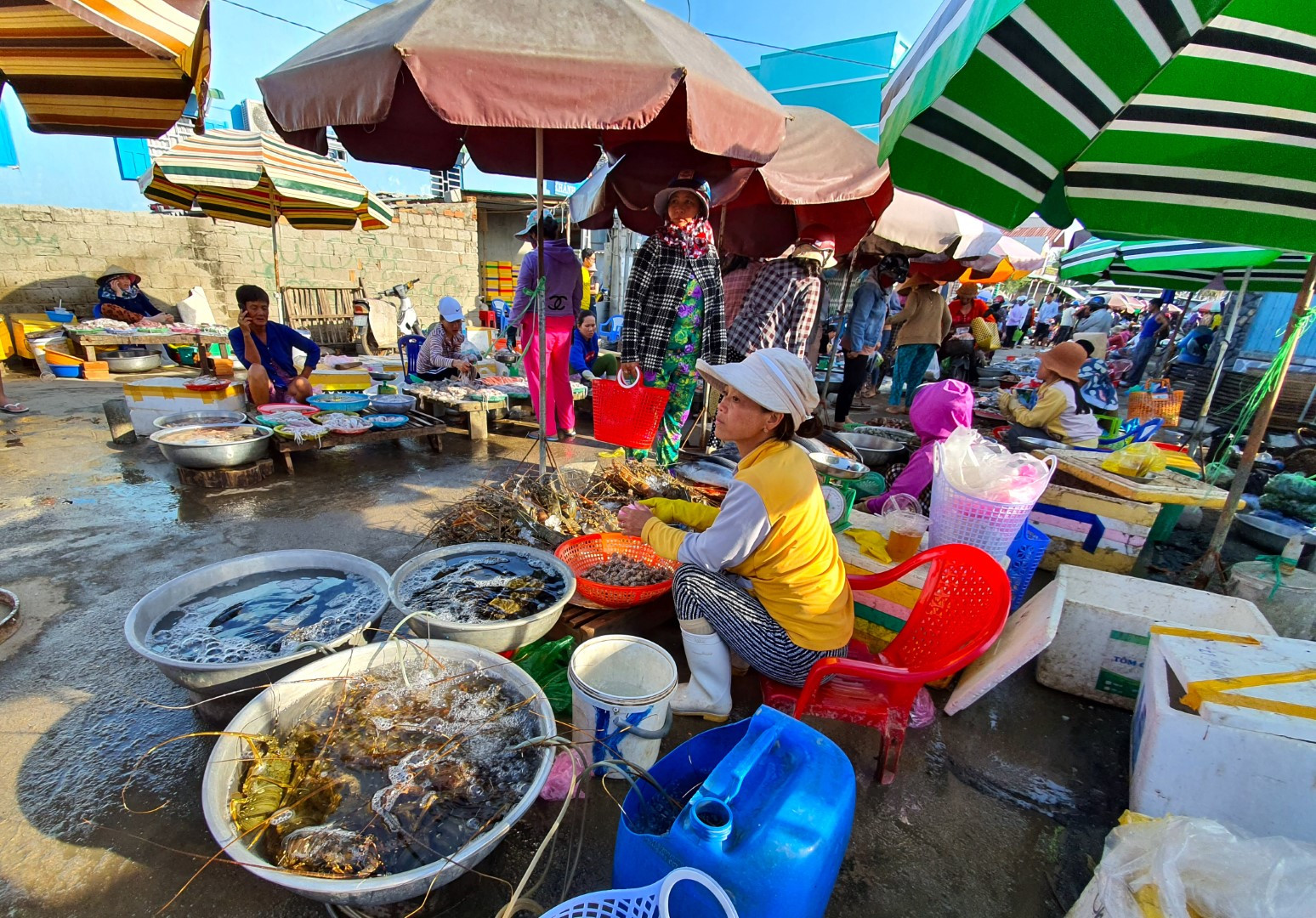 | Ngoài mua hải sản tươi ngon như tôm, cua, ốc, ghẹ, cá, khách còn có thể mua đồ khô như mực, cá, bánh tráng hay các loại gia vị như hành, tỏi, mắm nêm đặc trưng của Ninh Thuận. |