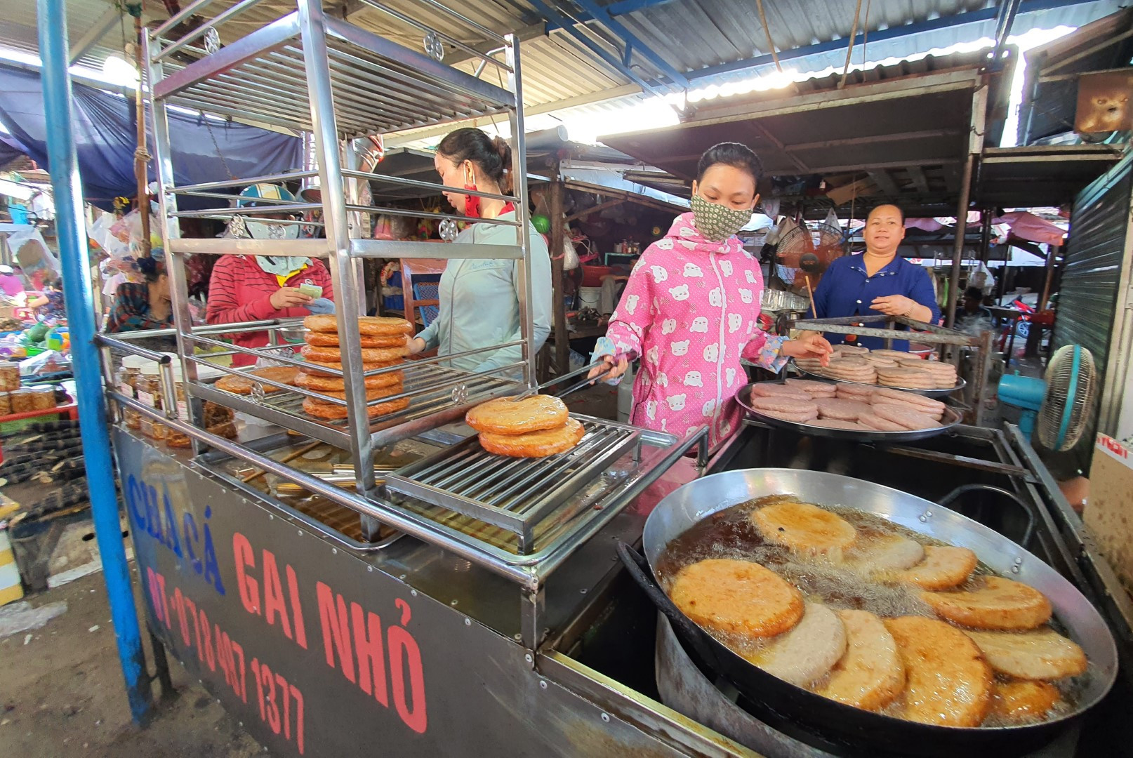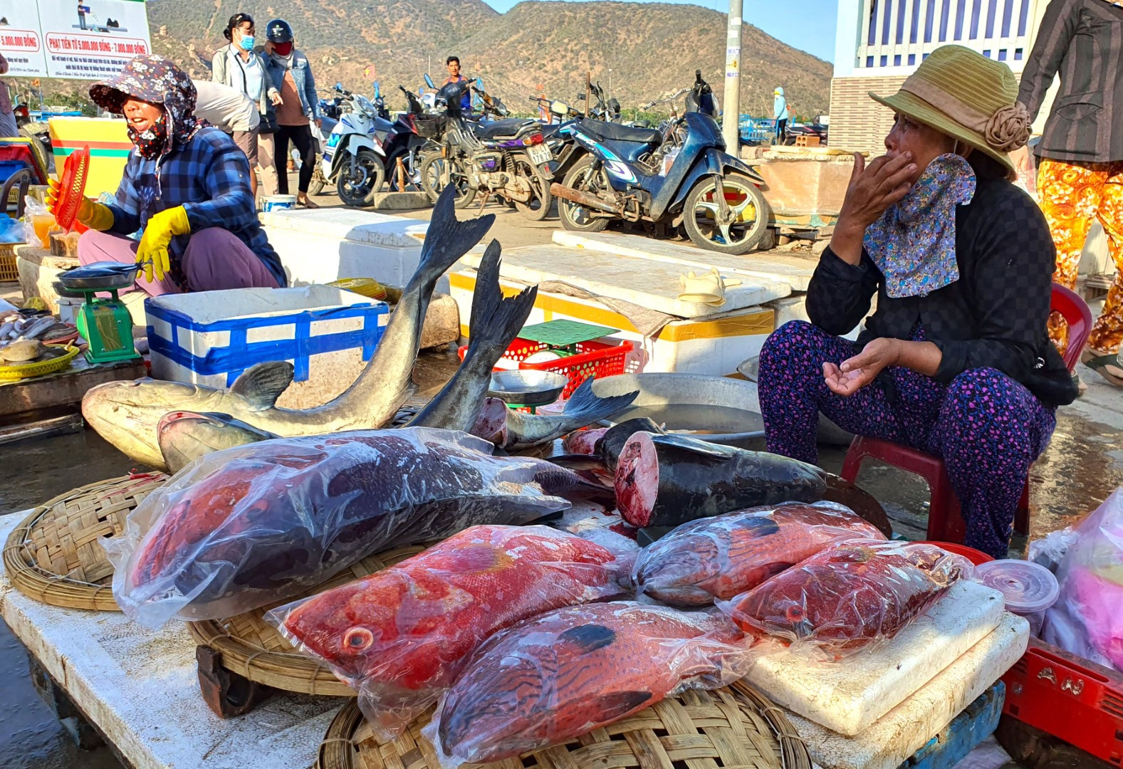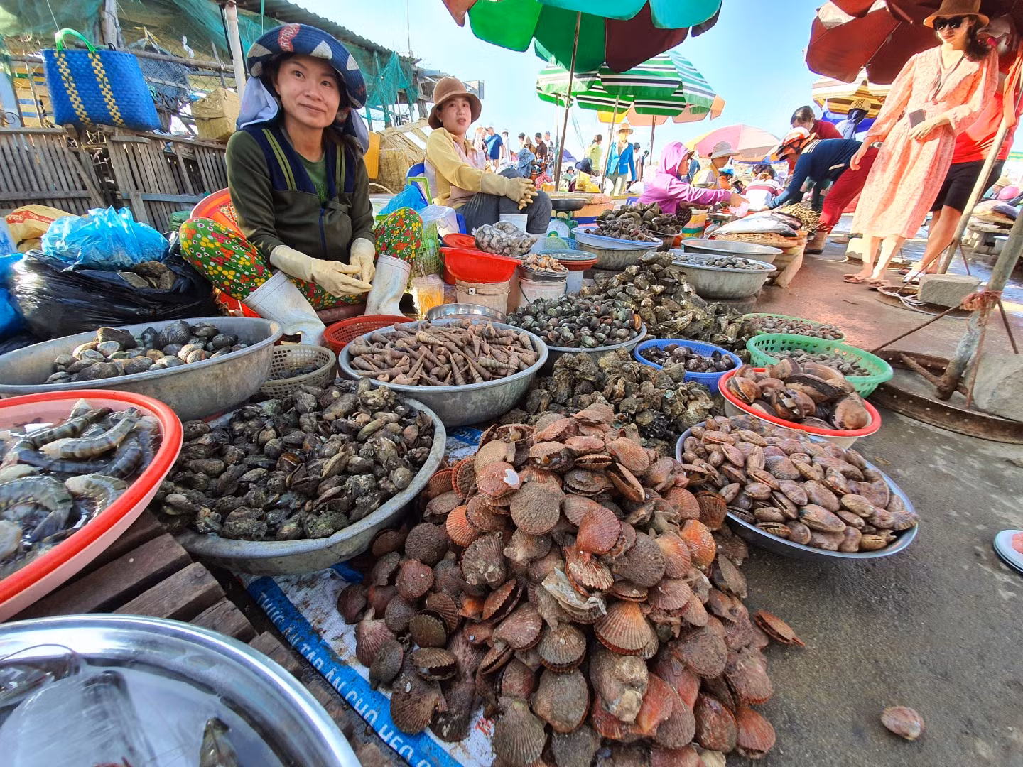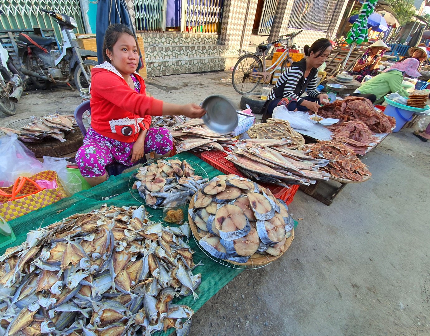 | Ngoài mua hải sản tươi ngon như tôm, cua, ốc, ghẹ, cá, khách còn có thể mua đồ khô như mực, cá, bánh tráng hay các loại gia vị như hành, tỏi, mắm nêm đặc trưng của Ninh Thuận. |