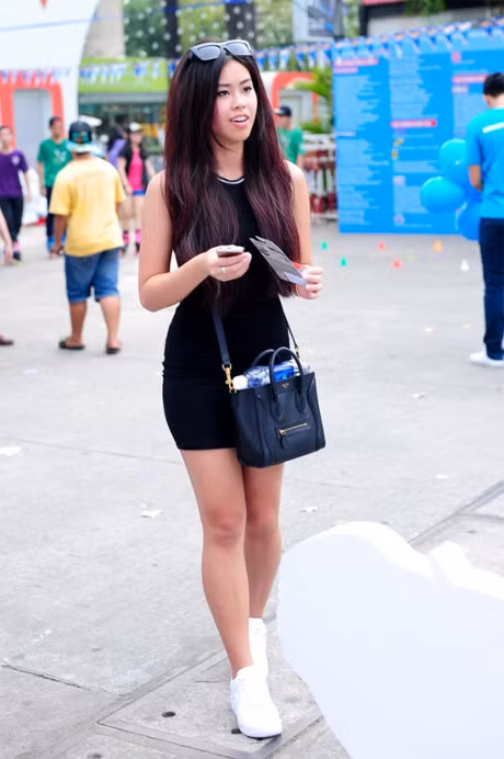 Chân váy mini, áo ba lỗ và túi YSL tạo lên cho Thảo Tiên vẻ ngoài xinh tươi và gợi cảm.